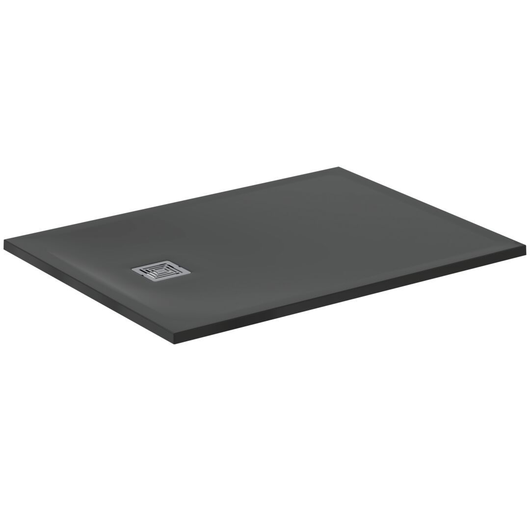 Sprchová vanička UltraFlat S + z materiálu IdealSolid farba čierna a špeciálnou povrchovou reliefnou vrstvou GelCoat. Vzhľad povrchu imituje hrubo otesaný kámeň. Protišmyk trieda C podľa normi EN 51097. Dodávané vrátene designového krytu z nerezovej oceli.